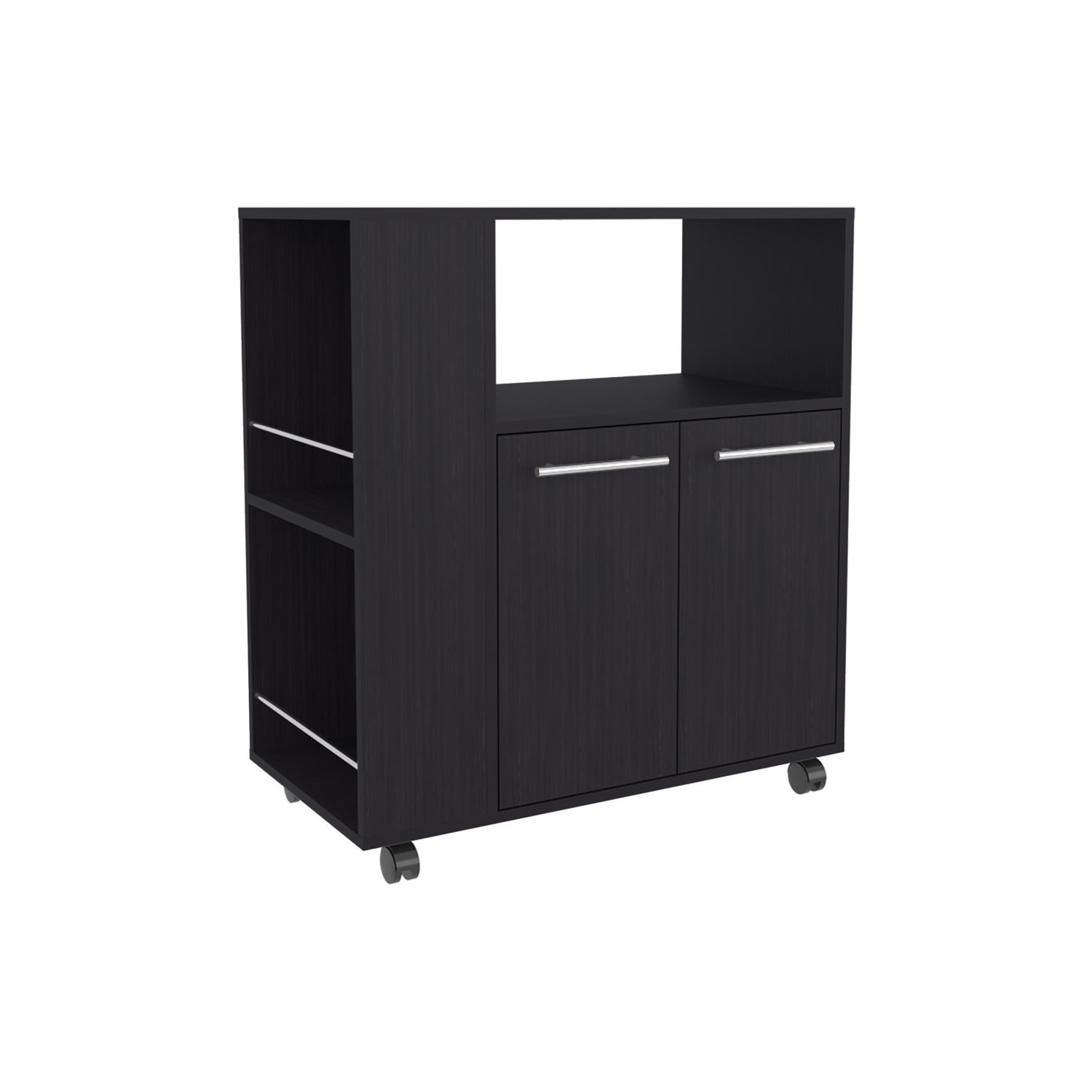 Linden Kitchen Cart with Microwave Shelf, Open Storage, and Two-Door Cabinet, Wengue"Compact and versatile kitchen cart designed to optimize your kitchen space. Features a dedicated microwave shelf for convenient placement of your appliance, an open storage compartment ideal for frequently used items or decor, and a two-door cabinet with interior shelving for concealed storage of utensils, pantry items, or cookware.Equipped with rolling caster wheels, this cart offers effortless mobility, allowing you to move it wherever needed.Style: Modern Materials: Particle board and melamine.Dimensions: 32,8"" (H) x 29,5"" (W) x 15,7"" (D)."""
