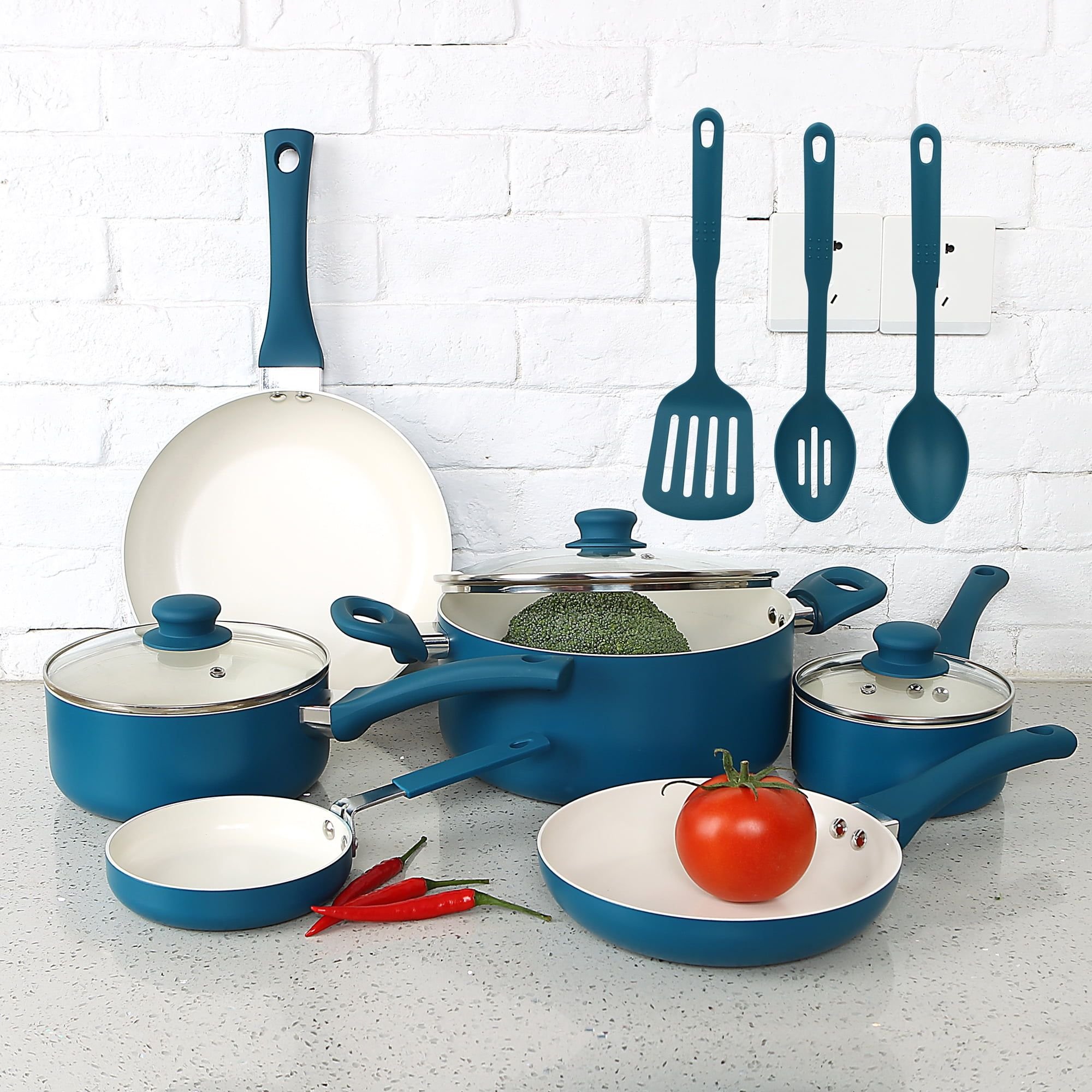 Ideal for everyday use at home, this  ceramic 12 pieces set corsair includes pans and kitchen utensils that can fulfill your everyday cooking needs at home. It is also ideal as a considerate and valuable gift to your close friends and family. The interior is coated with 2 layers of PPG Customized ceramic coating, which makes cooking and clean-up easy. The pans heat quickly and evenly due to the aluminum body, so this set will help you save time cooking as well. Cool, soft-touch handles provide a comfortable grip., while the outside color of this set will offer a bright pop of color to your kitchen.