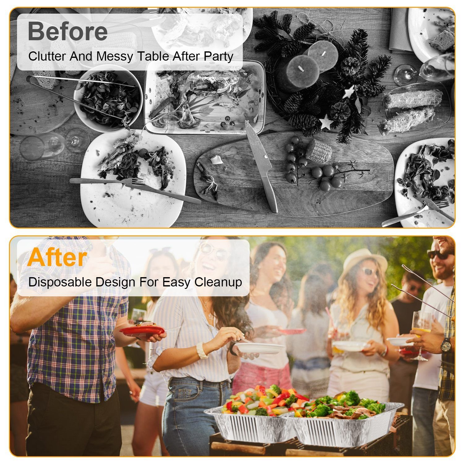 Food-Safe Material: Made of premium aluminum foil paper, the pans and lids are food-graded, non-toxic, ensuring both of the catering quality and safety of your friends and family. Moreover, thickened plastic utensils are sturdy enough for effortlessly garbing various kinds of foods.