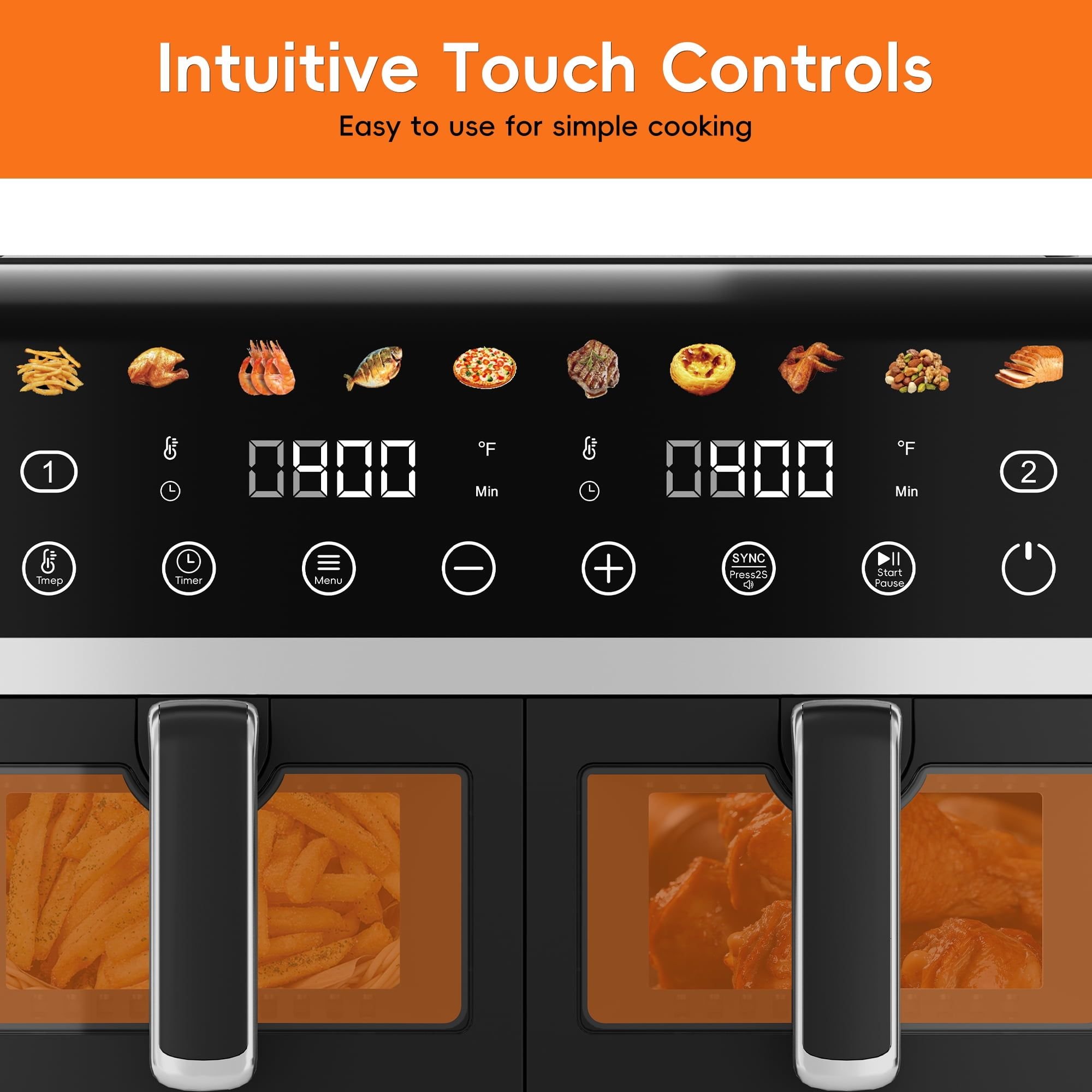 1.Two independent 5-quart baskets for cooking different foods at the same time
