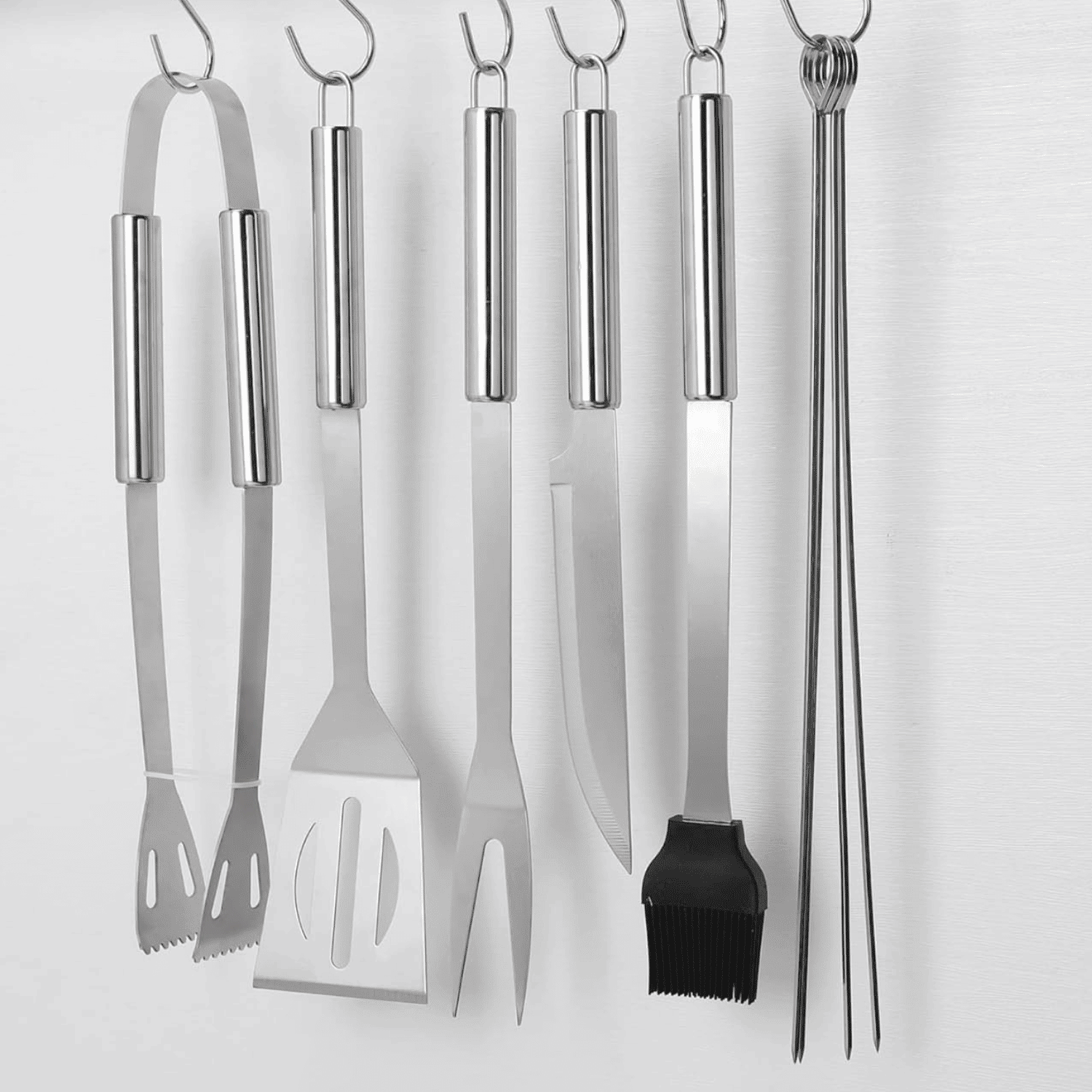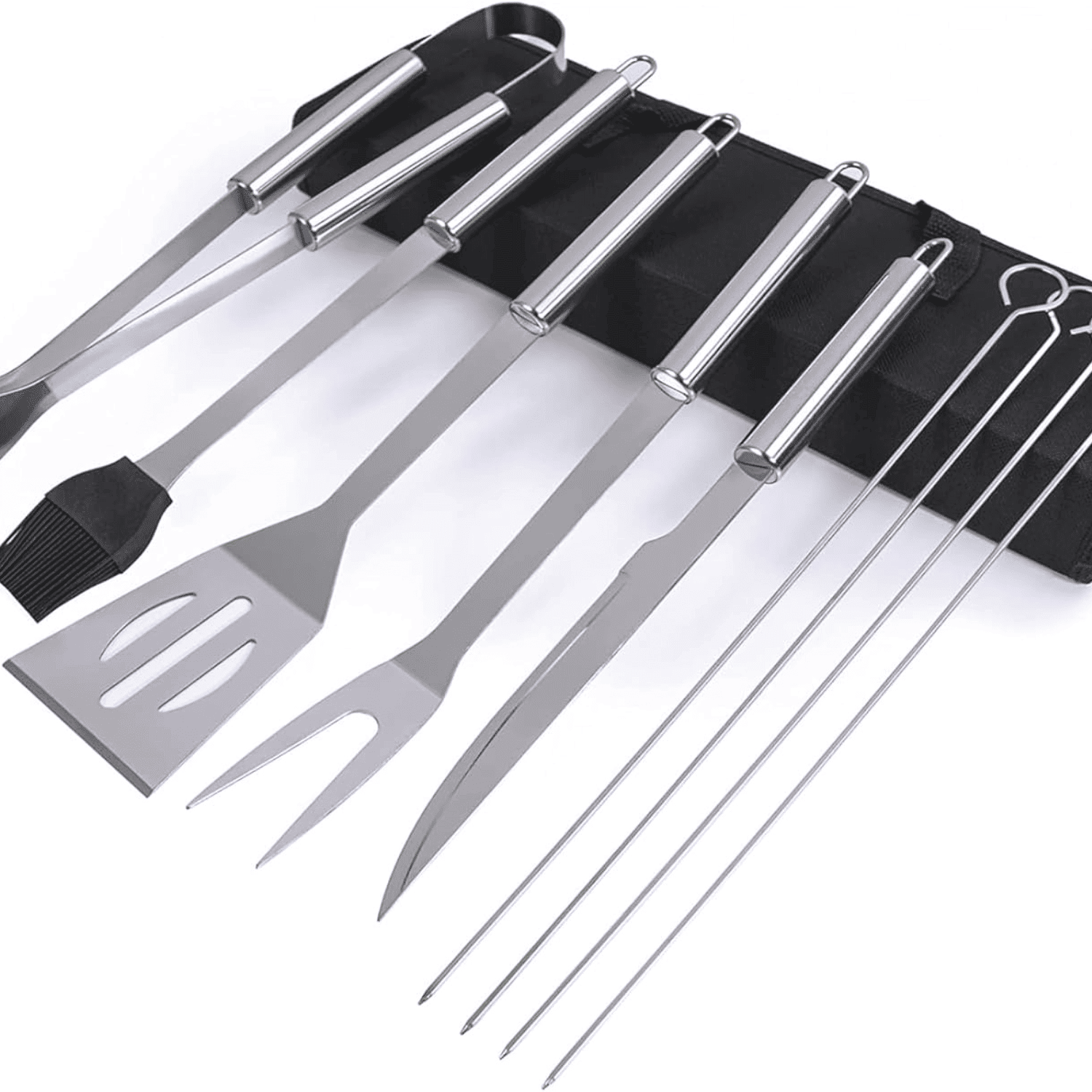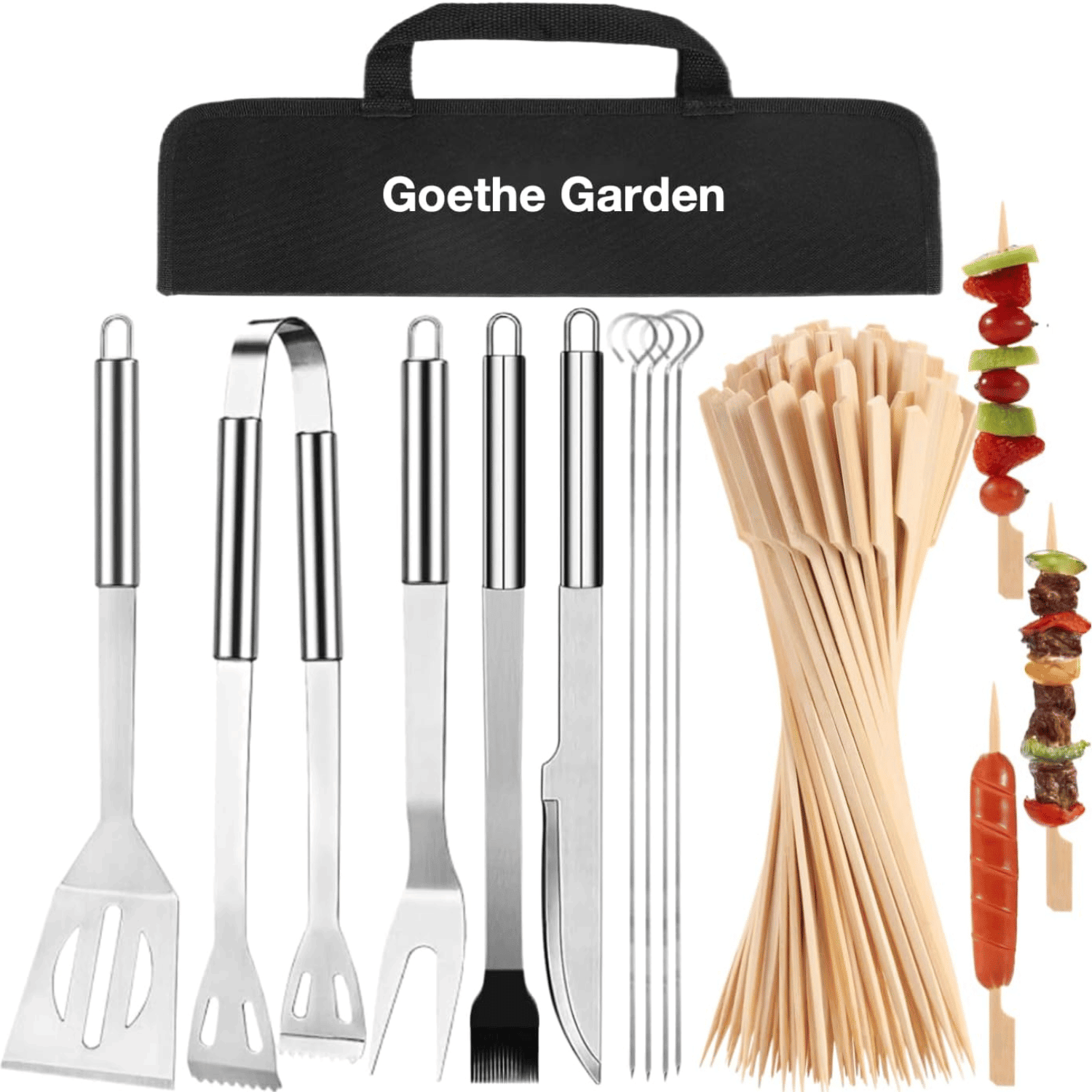 [Practical & professional Grill Set]: The grilling utensil set is professionally equipped with all the essentials to take your barbecue game to the next level and have you grilling like the pros. This grill accessories set includes grill fork, barbecue spatula, BBQ tongs, basting brush, knife, 4 skewers and a convenient storage bag for keep all heavy duty bbq accessories stays in order and protected with life-long lasting. [Durable & Exceptional Quality]: The grill kit is made of extra thick stainless steel, so there is no worry about the grilling accessories become breaking or bending. And this grill utensils set is constructed with stainless steel , you'll be amazed how sturdy and comfortable each bbq set grilling tool feels in your hand. Portable Barbecue Bag]: Grill accessories are packed in a portable and durable cloth bag, which is lighter than aluminum grill box and not easy to break and be out of shape during transportation. And elastic band in cloth bag can easily fix grill accessories. Make them in order, you can pick it up easily when open the bag. [Ideal Gift Set]: Goethe Garden grill tools set is an ideal gift for Father's Day, birthday, Halloween, Thanksgiving Day, Christmas,etc. It’s operated easily and very friendly both for newbies and master. Also a perfect option for organizing beach parties and camping barbecues. [About Goethe Garden]: The utmost care in quality and dependability were taken to produce our barbecue tool sets. Because we not only aim to offer every premium product, but also stand by the satisfaction of our customers. Also, all of our grill sets are strictly inspected before we ship them out to you. If you not satisfied with our product for any reason, please contact us, we will take care of it in time.