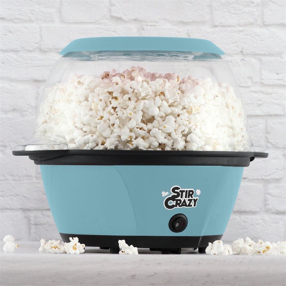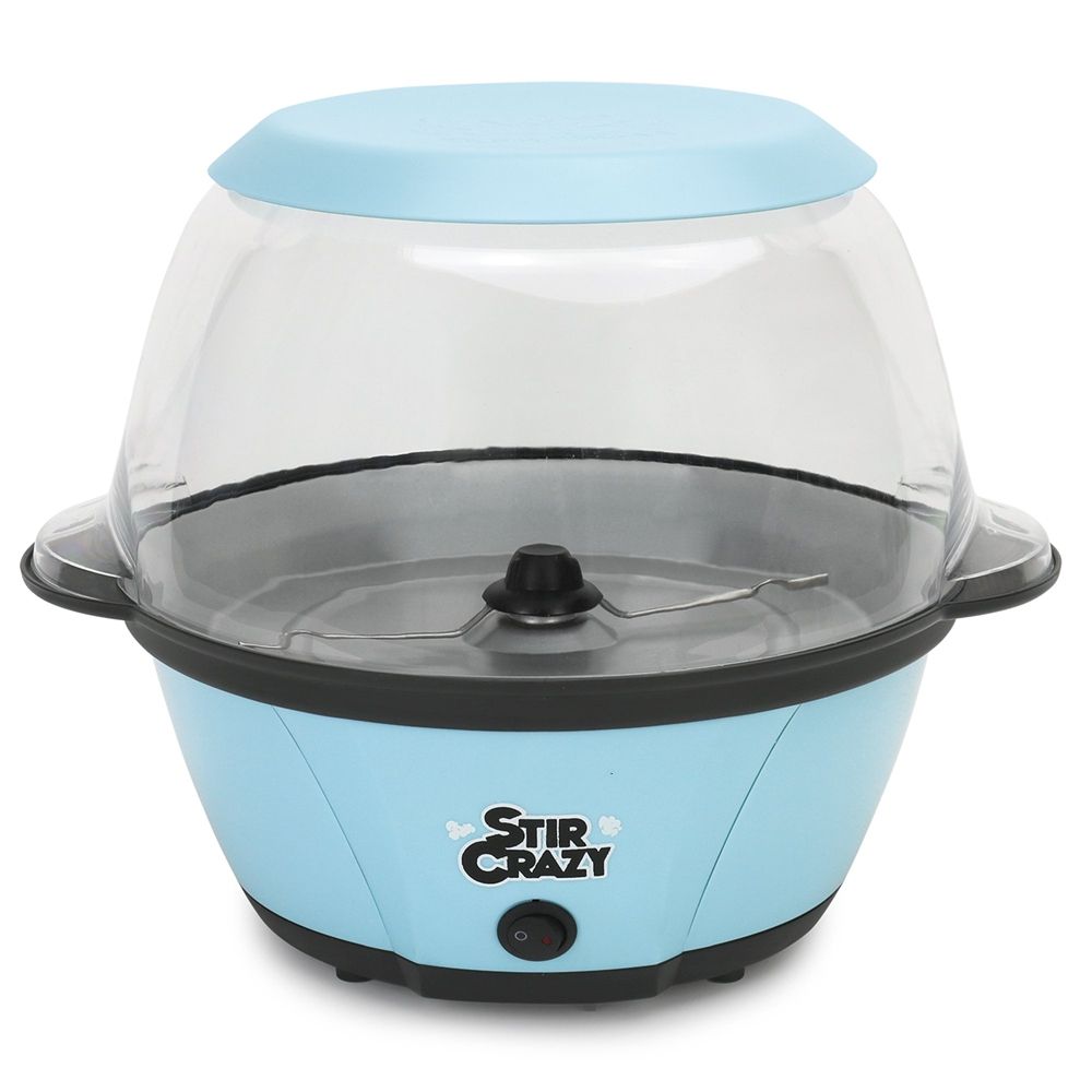 With the6Qt. Stir Crazy Stirring Popcorn Machine you can quickly whip up a batch of delicious; hot; fluffy popcorn. Now you can have traditional; move-theater popcorn taste in your home with the stir rod technology that keeps kernels moving to prevent any burning. The butter melting well in the cover butters popcorn as it pops. Then use the snap on cap when you use the cover as a serving bowl. The ventilation vents release moisture ensuring great-tasting; crunchy popcorn. When popping is done clean up is a breeze with the non-stick surface and dishwasher-safe cover and butter lid. A simple on and off button makes operation a breeze. The space saving design offers onboard cord wrap and nesting storage. With four quarts (24-cups) per batch; you’ll look forward to serving this traditional treat for everyday snacking; at-home movie nights or for any fun occasion.