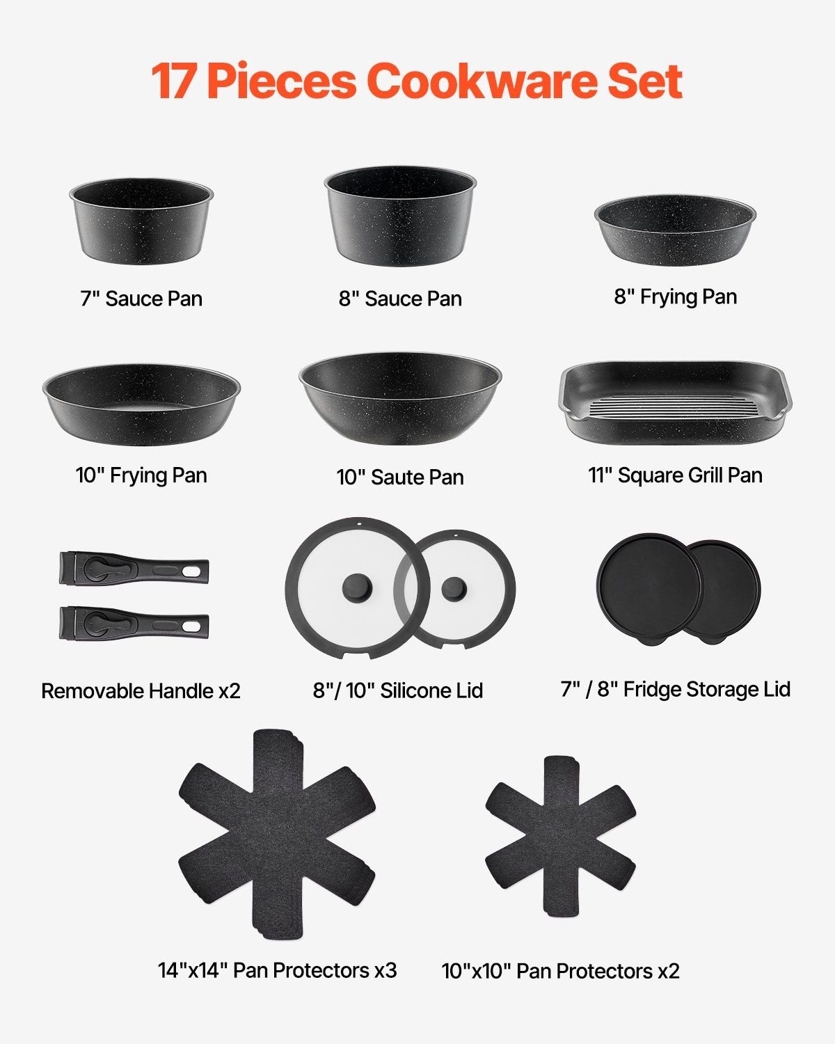 · 17-piece Cookware Set: A versatile pots and pans set that includes: 7in sauce pan, 8in sauce pan, 8in frying pan, 10in frying pan, 10in saute pan, 11in square grill pan, 2 removable handles, 8in silicone lid, 10in silicone lid, 7in fridge storage lid, 8in fridge storage lid, 2 10x10in pan protectors, and 3 14x14in pan protectors.
