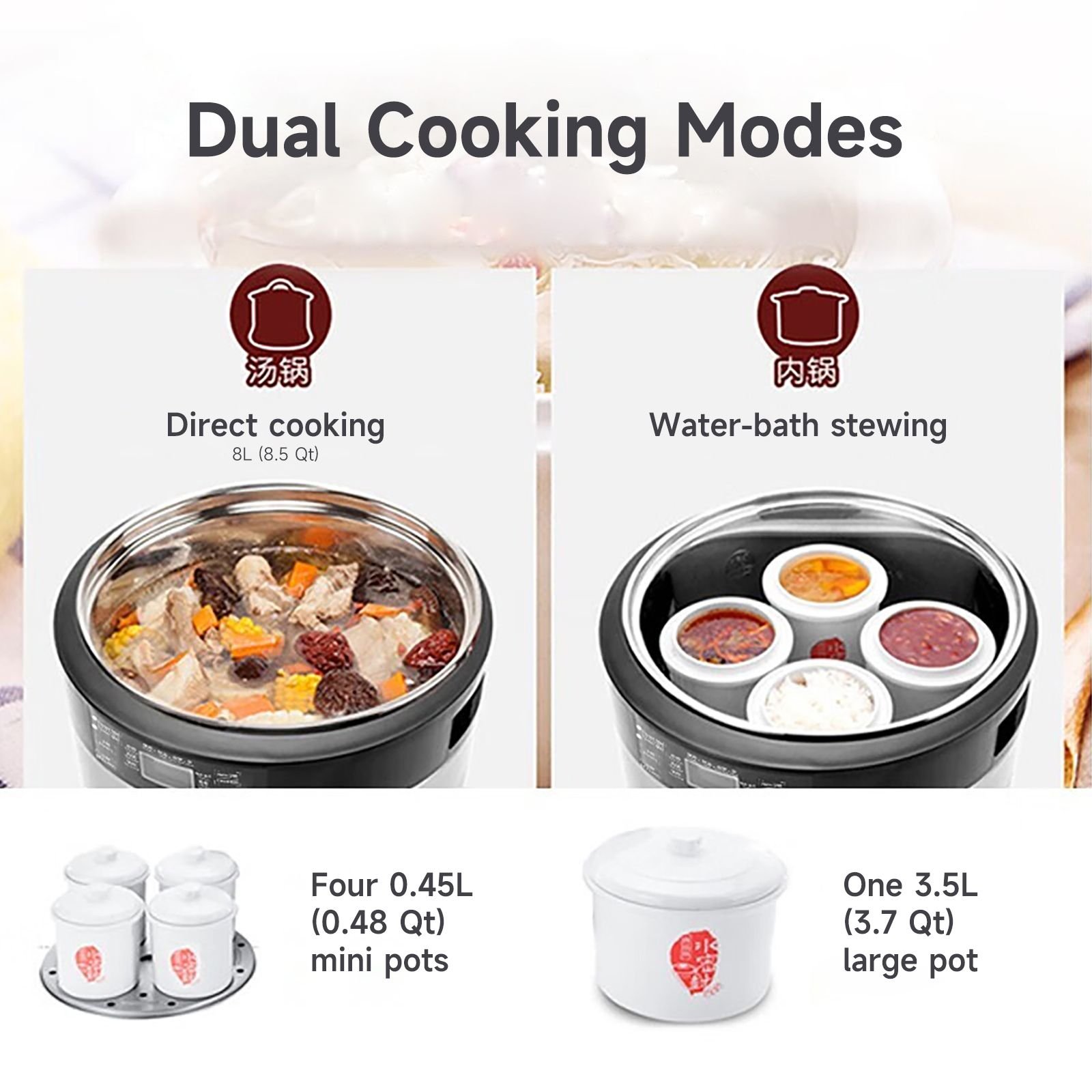 1.Dual Cooking Modes Use the 8L (8.5 Qt) stainless-steel inner pot for direct cooking, or switch to the ceramic set (3.5L + 4×0.45L) for gentle water-bath stewing. Avoid very thick porridge to prevent sticking.